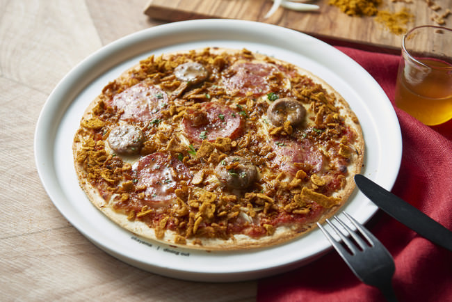 ジューシーなソーセージとサラミのピッツァにオリジナルのカレースパイスを合わせた1枚。