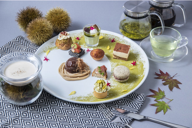 パティシエがつくる栗をテーマにしたスイーツと、蔵前にあるお茶屋さん「NAKAMURA TEA LIFE STORE」とコラボした秋のアフタヌーンティーケーキセット。特にお勧めなのは、煎茶の香りを移したガナッシュシャンティを上に絞った秋の花・金木犀の香り感じる「煎茶と金木犀のタルト」に、ほうじ茶の香ばしさと和栗の優しさを合わせ日本茶に合うようにと考えた「栗のトロンプルイユ」。秋限定のアフタヌーンティーセットです。