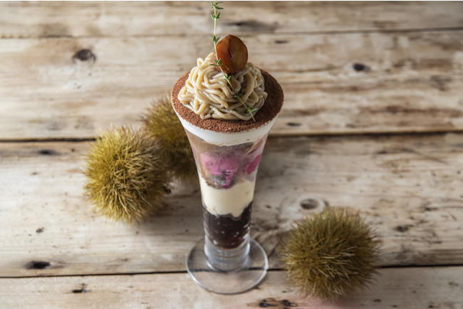 モンブランとティラミスを掛け合わせたイメージでつくられたパティシエ自慢の秋パフェ。コーヒーゼリーと栗のブランマンジェにカシスソルベをアクセントにした栗のティラミスの上には、さくさくのメレンゲ、愛媛県産の優しい甘味のマロンクリームと渋皮栗をのせた高さ22cmのパフェに仕上がりました。