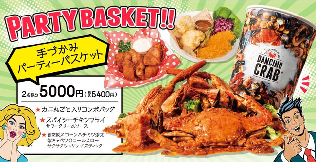 とんかつ専門店「かつや」などを展開するアークランドサービスホールディングス株式会社の子会社、海外の本場の味を日本で展開する株式会社ミールワークス(本社:東京都千代田区、代表取締役社長:小島 一生)の「美味しくて楽しい食のエンタテインメント」をコンセプトにした手づかみシーフードレストラン「DANCING CRAB」(以下、ダンシングクラブ)では、テイクアウトで人気の「手づかみパーティーバスケット」の内容をリニューアル、お家でのパーティーにぴったりの「手づかみパーティーバスケット」第3弾を、東京店・大阪店で9月13日(月)より販売いたします。