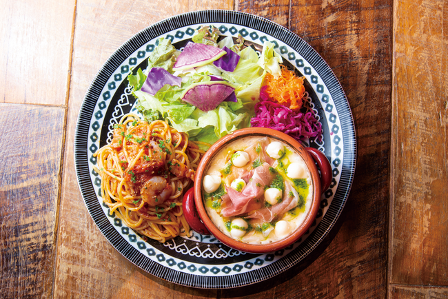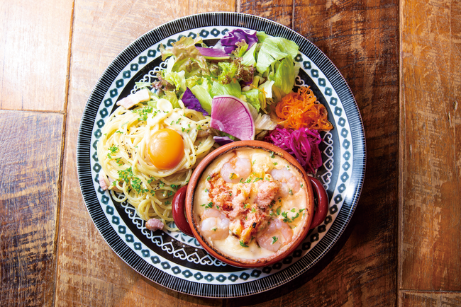 海老とカニの旨味がたっぷりたのしめるドリアに、選べるパスタとサラダをワンプレートで。サラダは、自家製の農園ドレッシングでどうぞ。