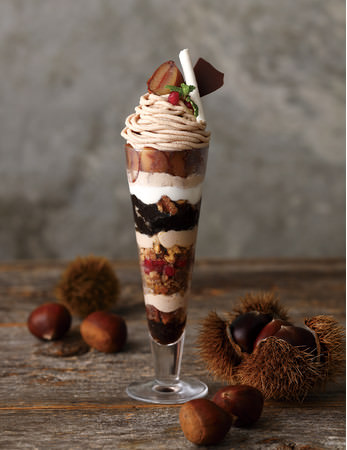 程良い甘さのマロンクリーム、コーヒーゼリー、栗の甘露煮とザクロ、クレーム・シャンティを6層仕立てに。バニラアイスを合わせたモンブラン風パフェです。