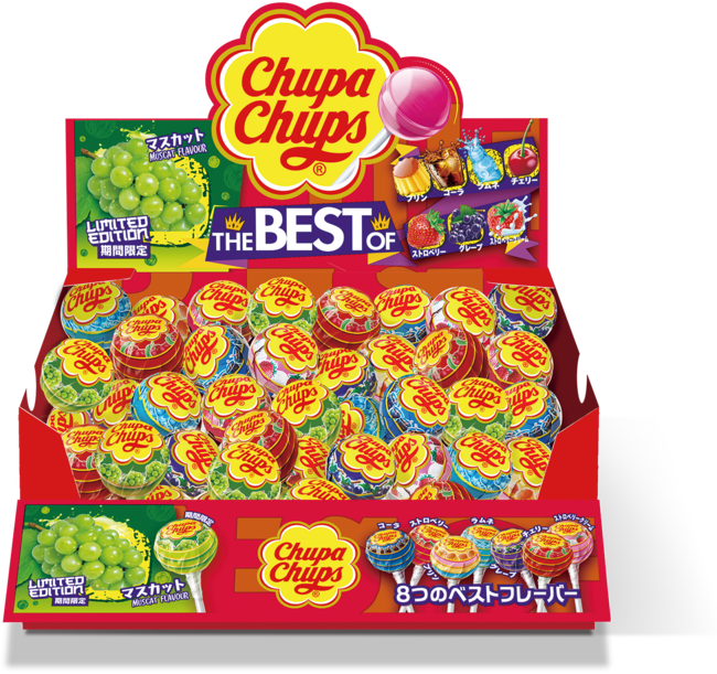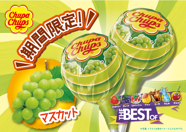 今回、リニューアル発売する「チュッパチャプス ザ・ベスト・オブ・フレーバー」には、フレッシュでジューシーな甘さが特徴の『マスカット』が期間限定で登場。