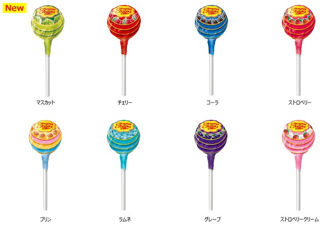 チュッパチャプスの代表的な人気フレーバー7種類(「コーラ」「ラムネ」「グレープ」「ストロベリークリーム」「ストロベリー」「プリン」「チェリー」)に、爽やかな緑色のパッケージに包まれた、秋の始まりを感じるみずみずしい甘さの期間限定フレーバー『マスカット』を加えた合計8種類で展開いたします。