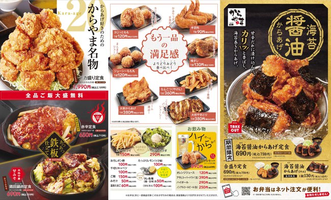 過ごしやすい気候で「食欲の秋」らしさが増してきたこの時期に、ご飯がすすむメニューが新登場。甘辛いだし醤油を合わせた「からやま秘伝のたれ」で漬込んだ鶏肉に、海苔を巻きカリッと揚げて甘辛だし醤油にくぐらせる。絶妙な甘じょっぱさでご飯がすすむ「海苔醤油からあげ」は、老若男女楽しめる一品です。
