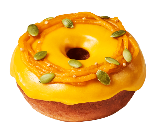 甘さの中に塩味をアクセントにきかせたパンプキングレーズに、こっくりとしたかぼちゃ餡やパンプキンシードをトッピングしました。イエローが映えるこの時期にぴったりの期間限定ハロウィンドーナツです。