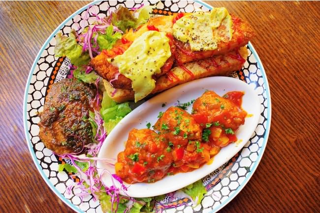 1.大豆ミートの3種盛り(ミートボールのアルホンディガス、ハンバーグのコフタ仕立て、ハムカツの台湾官財パン風)