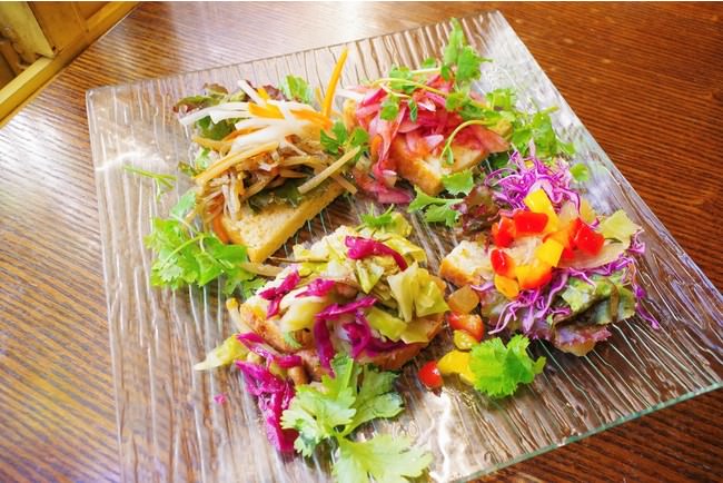 2.天然酵母パンと米粉パンのスモーブロー(ハーブやスパイスで味付けした野菜を北欧風オープンサンドで)