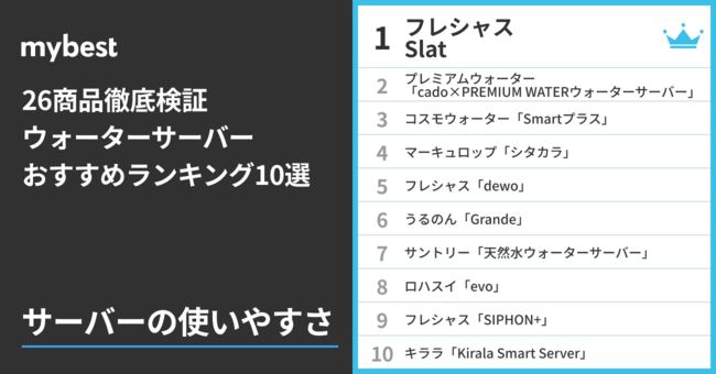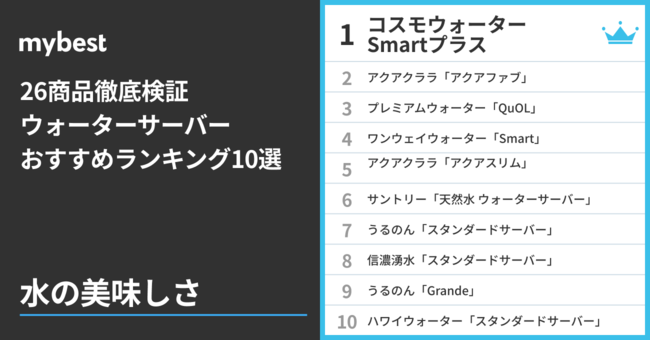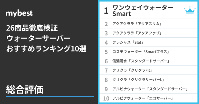 株式会社マイベスト(本社:東京都中央区、代表取締役CEO:吉川徹)が運営する、“選ぶ”を楽しくカンタンにするメディア「mybest」は、人気のウォーターサーバー26商品を自社で調査・検証し、その結果を自社メディア(https://my-best.com/2201)にて公開しました。
