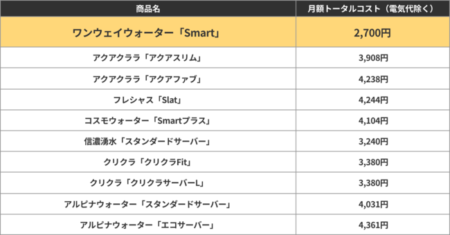 - 総合評価1位に選ばれたのはワンウェイウォーターの「Smartサーバー」。評価のポイントになったのはコスパの高さで、レンタル料などの維持費がかからないことから、月額のトータルコストは水代の2,700円のみ。上位のウォーターサーバーと比較しても、かなり安い価格で利用できることがわかりました。