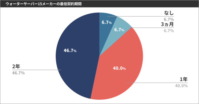 さらに、ウォーターサーバーの最低契約期間についても調査すると、15メーカーのうち、7社が2年契約に設定しており最多となった。また、全体の傾向として、RO水を取り扱っているメーカーに比べ、天然水サーバーは契約期間が長く、最低でも2年契約が基本だった。