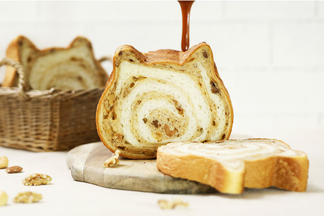また、生地の味わいだけではなく、食感もお楽しみいただけるようにクルミも使用しているので、香りと食感の両方で秋を感じるねこねこ食パンとなっています。
