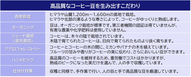 ヒマラヤンコーヒーは、コーヒーの品質鑑定者(Q-Graders)たちが集うSCAA(米国スペシャルティコーヒー協会)で、88.75点という高いスコアを授与され「スペシャルティコーヒー」という評価を受けました。スコア88.75点は大変高く、同年のエル・セドラル農園のゲイシャ(コスタリカ、88.71点)エル・ソコロ農園のパカマラ(グアテマラ、88.5点)と同等のクオリティです。甘みの中に漂う香ばしさ、ミントの風味とともに現れるナッツ感、穏やかな酸味、歯切れの良さと滑らかさが特徴です。