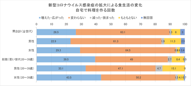 令和3年3月に農林水産省が発表した「新型コロナウイルス感染症と食生活の変化 自宅で料理を作る回数」(下記グラフ)を見ると、全体の約26%が新型コロナウイルス感染症の拡大前に比べて、「自宅で料理を作る回数が増えた」と回答しています。その中でも若い世代(20~39歳)の約40%が、料理を作る回数が増えたと回答し、若い世代の自炊に対する意識の変化がみられます。