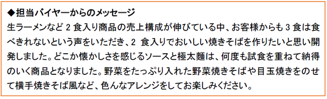 麺商品においては、食べきれないというお客様の声を反映して3食入りから2食入りの商品が増えており、使い切りやすい2食入りを採用しました。