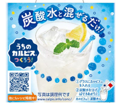 裏面には家の中で簡単に作れる「カルピス」と相性ぴったりのアレンジレシピとして炭酸割りの記載をしています。