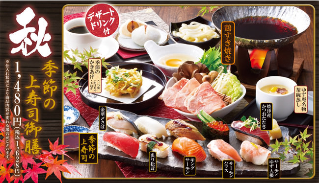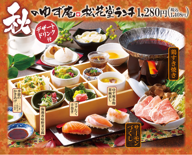 平日のランチタイム限定の「松花堂ランチ」と「季節の上寿司御膳」が、秋の献立で登場。ほかにも、「お寿司とうどんしゃぶ膳」と「牛すき焼き膳」は、土日祝も販売いたします。デザート・ドリンク付きのセットは、秋のデザート3種からもお選びいただけます。
