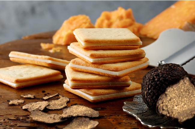 北海道産牛乳とチェダーチーズ、トリュフを混ぜ込んだクッキーに、トリュフ風味のチョコレートプレートをサンドしました。ブランド10周年を記念した、プレミアムなクッキーです。