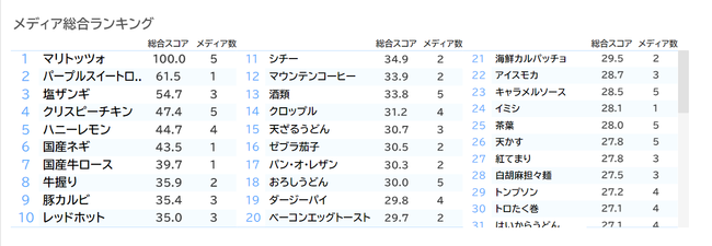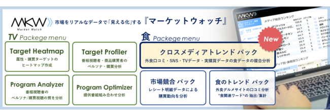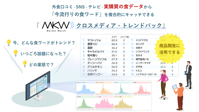 CCCマーケティング株式会社(本社:東京都渋谷区、代表取締役社長:北村和彦、以下「CCCマーケティング」)と株式会社Tポイント・ジャパン(本社:東京都渋谷区、代表取締役社長:長島弘明、以下 「Tポイント・ジャパン」)は、食に関わるさまざまな企業向けマーケティング支援サービス「Market Watch(以下、MKW) トレンド版※」にて、食にまつわる、外食口コミ、SNS、テレビ、実購買履歴のデータを横断で分析する「MKWクロスメディア・トレンド パック」の本格提供を開始いたしました。
