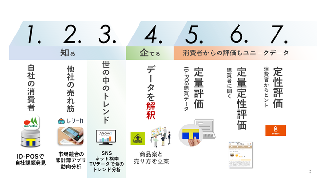 Tポイント・ジャパンは、CCCグループのアセットを総合的に活用した商品開発フローを整備し、Tポイント提携企業各社とともに商品開発を行っています。このたびリリースした「MKW クロスメディア・トレンド パック」は、主にメニューや食材の選定など、トレンド分析の市場調査(「3. 世のトレンドを知る」)の段階において、一部の提携企業様に先行してご活用いただいています。