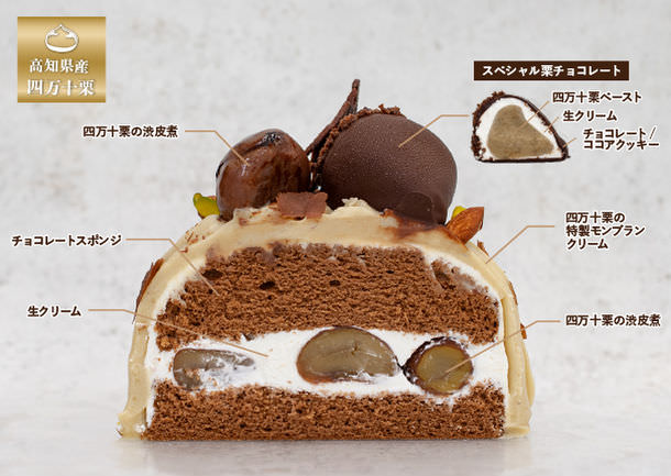 四万十川からの夕霧や朝霧によるたっぷりの水分と、長い日照時間の恩恵により、糖度高く大粒に育つブランド栗「高知県産四万十栗」。今年のモンブランデコレーションは貴重な四万十栗をたっぷり使用しました。さらには30年続く人気の季節商品「栗チョコレート」を大粒スペシャル仕様でトッピング。