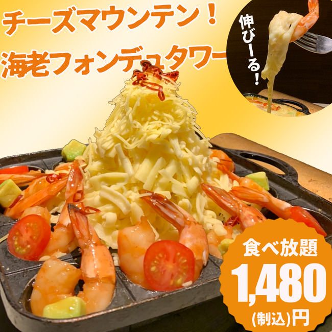 マウンテン海老チーズフォンデュタワーが食べ放題1480円でご提供致します。