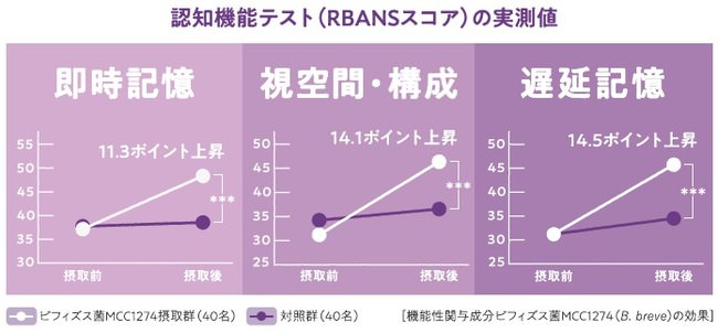 概要:『RBANS』による評価では、ビフィズス菌MCC1274(B. breve)の摂取により、プラセボ摂取群と比較