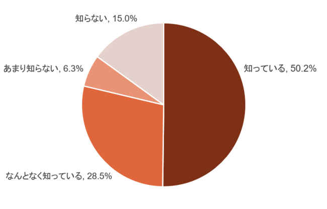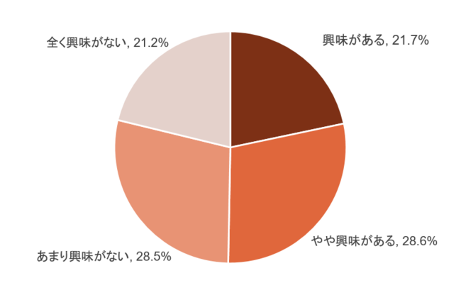 ヴィーガンの意味については、「知っている」という回答が約半数(50.2%)で、「なんとなく知っている」という回答を合わせると8割近く(78.7%)にのぼり、比較的認知率が高いことが伺えます。また、ヴィ―ガンへの興味についての質問では、「興味がある」「やや興味がある」との回答が約半数(50.3%)という結果になりました。