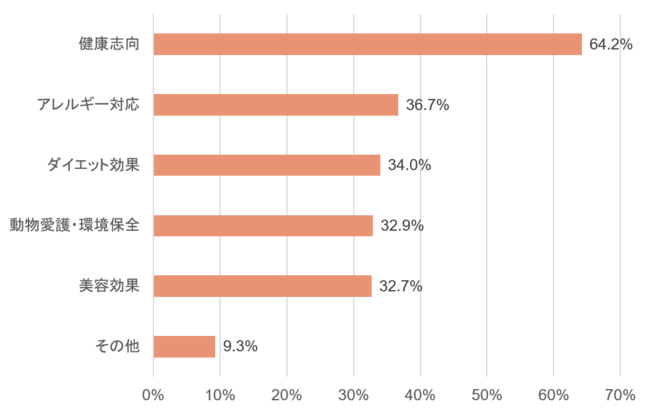 ヴィ―ガンに興味があると回答した人に、ヴィ―ガンに対して期待するポイントを聞いたところ、「健康志向」(64.2%)、「アレルギー対応」(36.7%)、「ダイエット効果」(34.7%)という、身体への負担軽減に関する回答が上位を占めました。また「動物愛護・環境保全」という回答もあり(32.9%)、エシカル消費への意識の高まりも伺えます。