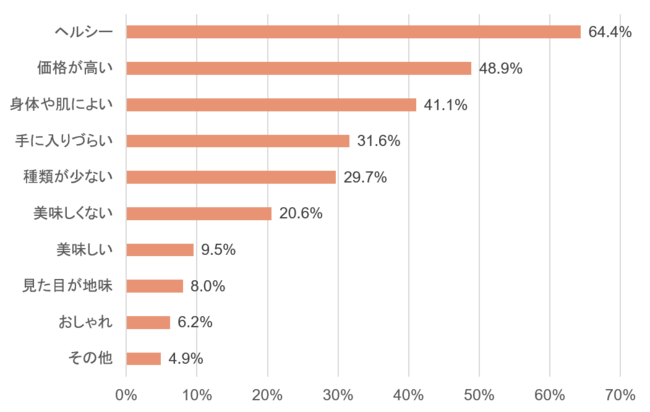 ヴィ―ガンスイーツと聞いて「食べてみたい」「やや食べてみたい」と回答した人は、7割超(76.5%)という結果になりました。また、ヴィ―ガンスイーツのイメージについて聞いたところ、「ヘルシー」(64.4%)、「身体や肌によい」(41.1%)といったポジティブなイメージが多数あがった一方で、「価格が高い」(48.9%)、「手に入りづらい」(31.6%)といった回答も多く、まだまだヴィ―ガンスイーツの購入にはハードルがあるようです。