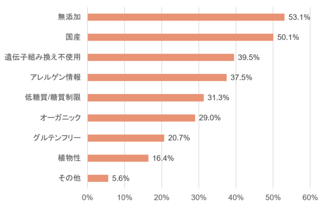 普段、食品(スイーツを含む)を選ぶ際に、原材料を確認するという人は約7割(69.8%)にのぼりました。また、原材料を確認すると回答した人にその際のポイントを聞いたところ、「無添加」(53.1%)、「国産」(50.1%)、「遺伝子組み換え不使用」(39.5%)など安心安全に関わる回答が多数ありました。その他、「アレルゲン」(37.5%)、「低糖質」(31.3%)などの回答も多く、ヴィ―ガンに限らず、健康面に配慮した食品やスイーツのニーズがあることが分かりました。