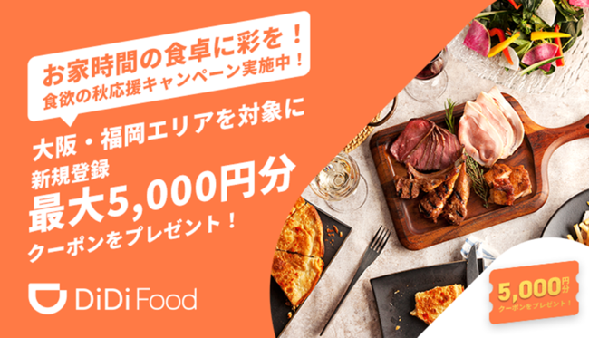 DiDiフードジャパン株式会社の運営するデリバリーサービス「DiDi Food」は、皆様のお家時間の食卓に彩を添えるため、食欲の秋キャンペーンを大阪・福岡エリアのお客様を対象に実施いたします。10月31日までに「DiDi Food」に新規登録いただいお客様に最大5,000円分のクーポンをプレゼントいたします。
