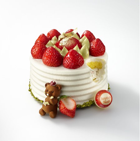 ケーキの右上がくりぬかれているのは、いたずらなクマの「ヌヌース」が食べてしまったから。国産苺とあまおうのムースを飾り付け、限定ジャージーの生クリーム、生地にカルピス発酵バターと新プレミアム太陽卵を使用した特別な味わいのショートケーキです。