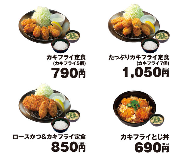 | 商品名 カキフライ定食(カキフライ5個) 790円 たっぷりカキフライ定食(カキフライ7個) 1,050円 ロースかつ&カキフライ定食 850円 カキフライとじ丼 690円 単品カキフライ(カキフライ2個) 300円 ※お持ち開いただけます。お持ち帰りのみそ汁は、別途60円でお買い求めいただけます。 ※全て税込価格です。 発売日 2021年9月29日(水)午後3時 ~ |