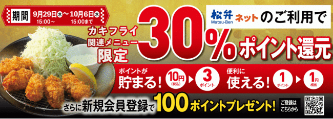 | ■カキフライ食べてポイント貯まる!30%還元キャンペーン実施! ▽キャンペーン期間 2021年9月29日(水)15:00~2021年10月6日(水)15:00 ▽キャンペーン内容 ▽対象商品 ▽ポイントの利用 ▽新規会員ご登録で100ポイントプレゼント! =例=========================================== 【詳しくはこちら】https://bento.matsuyafoods.co.jp/matsuben-net/search 券売機でお買い求めいただくよりもお得となっております。ぜひご活用・ご登録いただきお買い求めください。 |