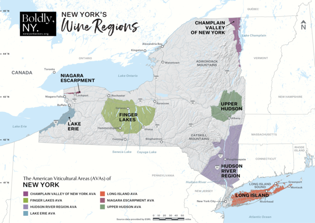 American Viticultural Area (AVA) とは Alcohol and Tobacco Tax and Trade Bureau, United States Department of the Treasury(アメリカ合衆国財務省、酒類タバコ税貿易管理局)が定義した境界に基づき、地理的特徴によって区別できる米国の政府認定ブドウ栽培地域です。 7つの主要な AVA は次の通り:Champlain Valley of New York(シャンプレイン・ヴァレー・オブ・ニューヨーク)、Finger Lakes(フィンガー・レイクス)、Lake Erie(レイク・エリー)、Long Island(ロングアイランド)、Hudson River Region(ハドソン・リヴァー・リージョン)、 Niagara Escarpment(ナイアガラ・エスカープメント)、Upper Hudson(アッパー・ハドソン)。更に、フィンガー・レイクス AVA 内には (Seneca Lake(セネカ・レイク)とCayuga Lake(カユガ・レイク))、ロングアイランド AVA 内には (The Hamptons(ザ・ハンプトンズ)と North Fork of Long Island(ノース・フォーク・オブ・ロングアイランド))の内包的な AVA があります。それぞれの産地には歴然たる土壌、地形、気候の組み合わせの違いがあり、そこで造られるワインには異なる個性が生まれます。