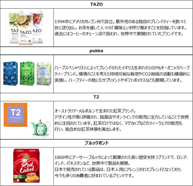 新会社「ekaterra(以下:エカテラ)」は、Lipton、Pukka Herbs、TAZO、Brooke Bond等紅茶・緑茶・ハーブティーの34ブランドを保有する世界最大のティーブランドカンパニー。世界各国での立ち上げとともに、日本では新会社「エカテラ・ジャパン」として発足いたします。ティーブランドを専門とした新会社にて、日本のティーバッグ紅茶市場1位※1の「リプトン」を主軸に、茶葉・飲料関連事業のより一層の拡大を図ります。今後は、リプトンのみにとどまらず様々なティーブランドを展開していく予定です。