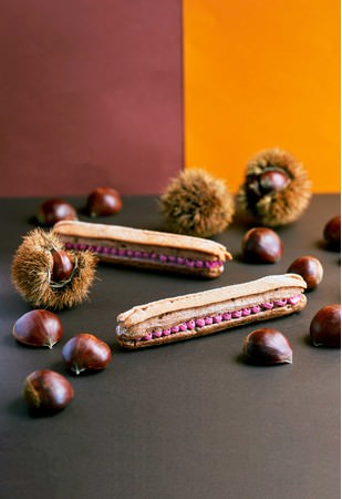 山鹿産和栗とフランス産洋栗の2種を味わえるモンブランエクレア。シュー生地の中は洋栗をペーストしたクリームと、カシスとホワイトチョコレートの紫色のガナッシュをサンド。熟成和栗そのものも大きくカットして入れました。栗本来の風味と深い甘みがカシスの酸味で引き立ちます。