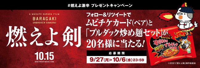 株式会社三養ジャパン(東京都新宿区 代表取締役:高海正)は映画『燃えよ剣』のムビチケ&ブルダック炒め麺詰め合わせをプレゼントするコラボキャンペーンを実施