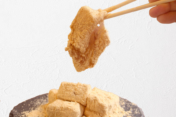 山菜のワラビの根の部分10kgから、わずか70gしか採れない、貴重な本わらび粉を使用しています。材料の配合や炊き方など試行錯誤を重ね、究極なやわらかさを追求し「とろとろ食感」が生まれました。爪楊枝が刺さらない程にやわらかいため、割りばしを添えて提供しています。プレーンの「和三盆」、食感のアクセントに北海道・十勝産のあずきを練り込んだ「あずき」の2種類をご用意しております。たっぷりとまぶした甘さ控え目なきな粉と一緒にお召し上がりください。