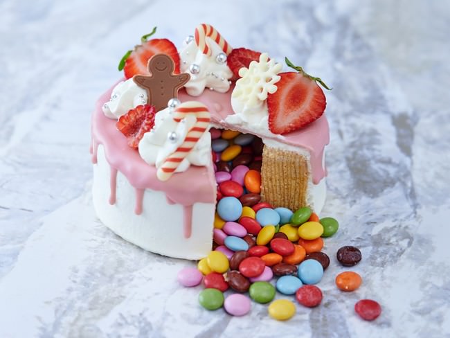 切るとカラフルなチョコレートが中からあふれ出すサプライズ感のあるケーキです。