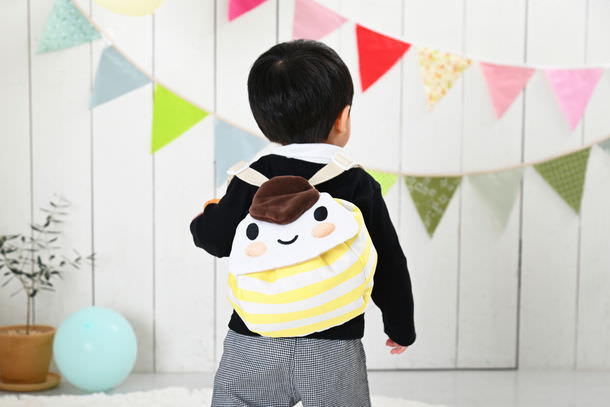 3. 黒蜜リーゼントがかわいい「くずもっちゃん」のリュックサックがお祝いをもちあげます!倖せを呼ぶイエローは男の子、女の子にもぴったりです。