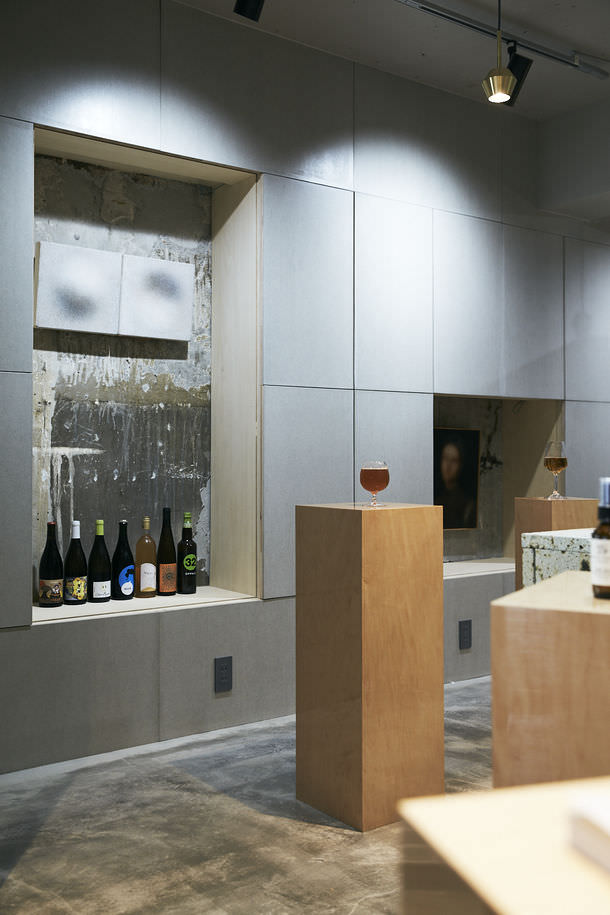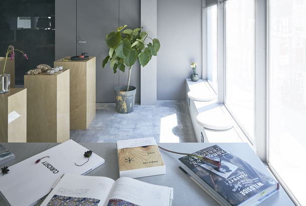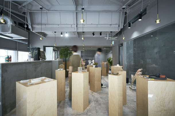 日本を代表する建築事務所「SANAA」出身で、建築設計から内装、家具、プロダクトデザイン、まちづくりなどの幅広い分野で活動する小野寺 匠吾が内装デザインを担当。1978年竣工の古いビルの一室をワンルーム形式に整理し、大きさの異なる3種類の可動式什器を並べ替えることで、用途に応じて自由にレイアウトできるようにデザインしました。こだわり抜かれた商品がそれぞれの什器に一品ずつ並べて置かれると展示品のようにスポットを浴びるのに対して、什器をまとめて並べると大テーブルのようになるなど、さまざまな見せ方を通して、その商品の生産者・製作者のストーリーや背景を伝えていきます。