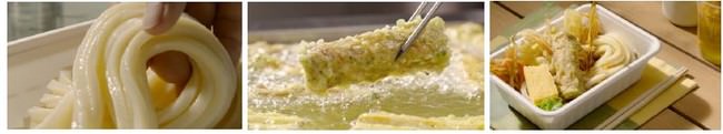 『丸亀うどん弁当』のうどんは、店内と同様、毎日一軒一軒すべてのお店で粉から打っています。うどんとの相性が抜群の天ぷらも丸亀製麺で手づくりできたてをご用意。あらかじめ作り置きするのではなく、ご注文を頂いてから、打ち立て茹でたての麺と手づくりの天ぷらやおかずを詰めてご提供。手づくり・できたてだからこそ味わえる、『丸亀うどん弁当』の“丸亀食感”をぜひお楽しみください。