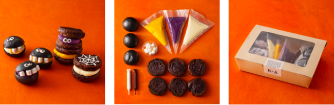「ハロウィンDIYキット」は、ココアを使用しブラックに仕上げたクイニーアマンとヴィエノワ生地のバンズ、クリーム3種類、チョコペン2種類、マシュマロをセットにしました。「紫イモ」「パンプキン」「ミルク」と3種の濃厚なクリームをお好みで絞り、チョコレートペンでアレンジして完成です。親子で楽しんだり、ギフトとしても最適です。