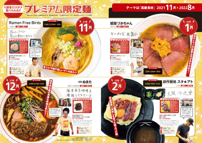 本誌読者しか食べることができない特製の限定麺を、人気店とコラボして作りました。今回は「高級食材を使った一杯」をテーマに、真鯛やウニ、馬刺し、フカヒレ、シャインマスカットなど贅沢な食材を使用した10杯が誕生。2021年11月から2022年8月までの間、10店舗がリレー形式で提供していきます。さらに今回は東京の人気店とのコラボも実現。RAMEN渦雷×饗 くろ㐂、地球の中華そば×竹末東京Premiumの2組による、“強力タッグ麺”もお楽しみください。