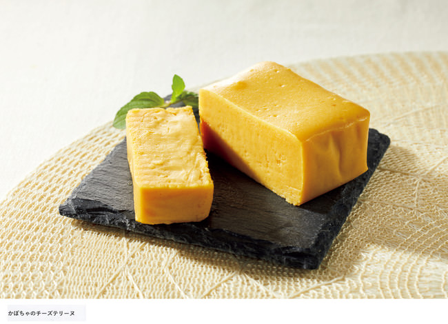 北海道産えびすかぼちゃのペーストを使用したかぼちゃ餡に、ナチュラルクリームチーズと北海道根釧地区の生乳を使用した、やさしいコクとまろやかな塩味がある口当りなめらかなクリームチーズを組み合わせたチーズテリーヌです。隠し味としてカラメルも配合することでさらにコクを出しています。