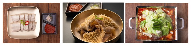 名物は、ジューシーな厳選皮付き豚をアツアツに茹でた「チェユッ」(写真左)。チョジャンやアミの塩辛を薬味にお召しあがりください。牛スジ、ハチノス、アキレス等のホルモンを日替わりで楽しめる「チャルラ」(写真中央)や、特製コチュジャンと牛・鶏の出汁をベースに煮た鉄板料理「トゥルチギ」(写真右)、卵と焼いた「白菜のジョン」、「辛口トッポギ」、「牛タンピリ辛煮込み」もおすすめの一品です。