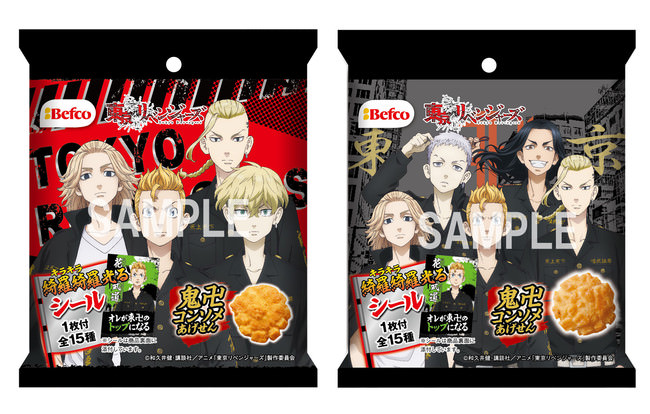 パッケージデザインは2種類あり、主要キャラクターがデザインされた、物語の世界観溢れるパッケージに仕上げました。中身は、主人公・花垣武道が好きな、コンソメ鬼パンチの味を再現した、一口サイズのあげせんべいになっております。また、1袋に1枚、綺羅綺羅(キラキラ)光るシールが付いており、全15種類あります。どんなデザインが出るかは開けてからのお楽しみ♪ぜひ集めてみて下さい。※シールデザインはランダムで封入しております。