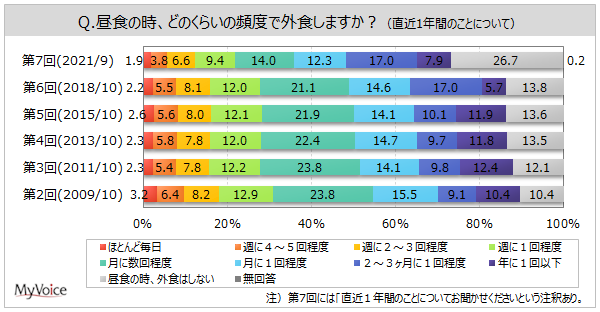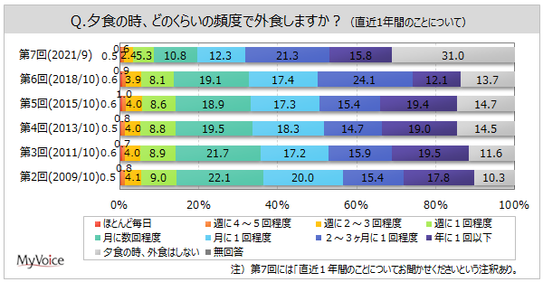 マイボイスコム株式会社(東京都千代田区、代表取締役社長:高井和久)は、インターネット調査を中心に提供している伊藤忠グループのリサーチ会社です。この度、7回目となる『外食』に関するインターネット調査を2021年9月1日~5日に実施し、10,162件の回答を集めました。本調査での「外食」は飲食店での食事のことで、持ち帰りやデリバリーは含みません。